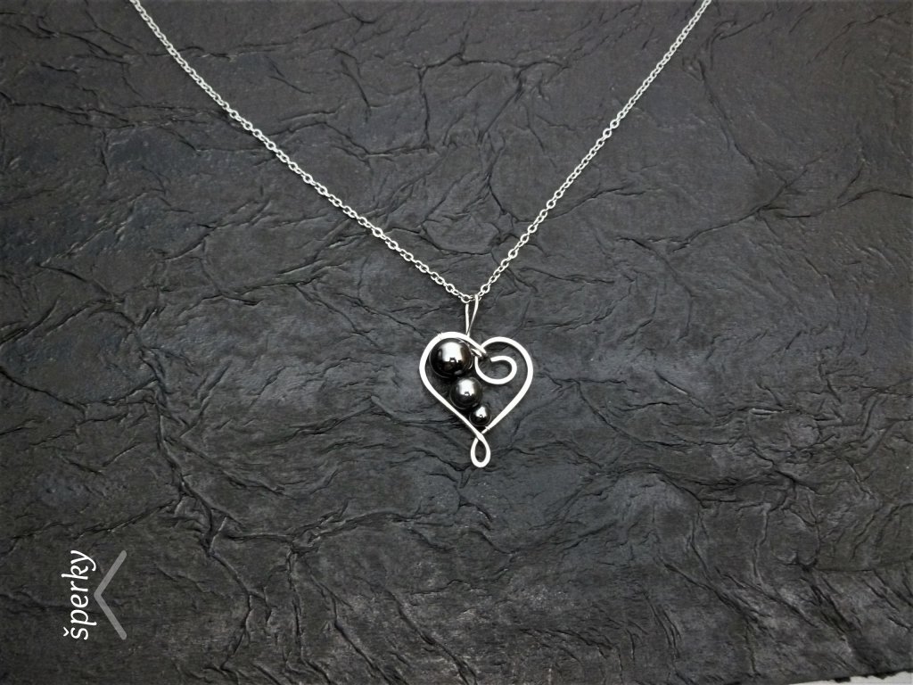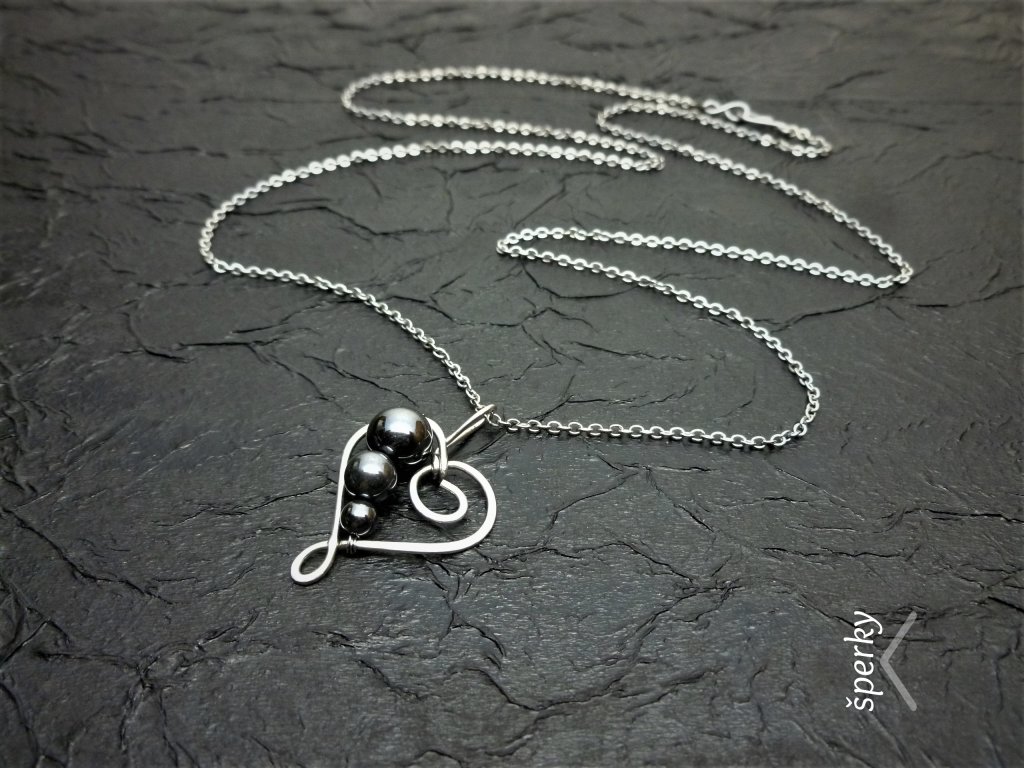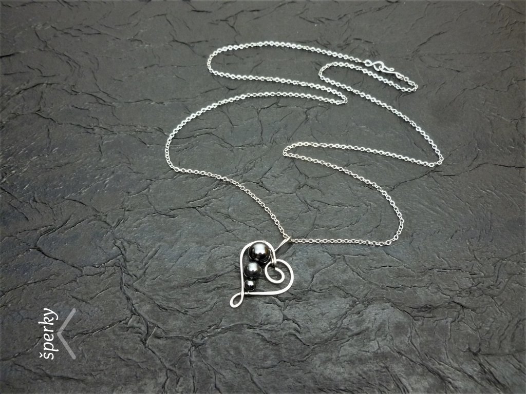 Náhrdelník z nerezové ( chirurgické ) oceli DIN 1.4404 ( AISI 316L ), doplněný korálky z hematitu 8, 6 a 4 mm. Na řetízku dlouhém 50 cm a přívěskem 3 x 2,5 cm. Celková váha 4 g.